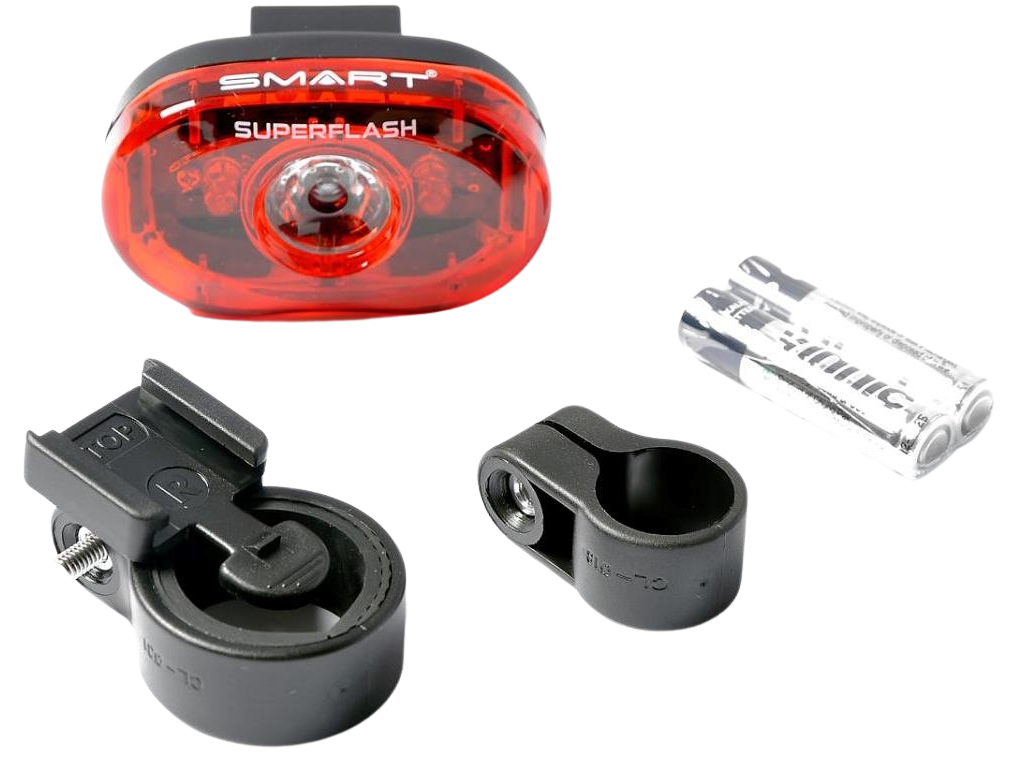 Smart Superflash er en kompakt og godkendt baglygte, der sørger for optimal synlighed under kørsel efter mørkets frembrud. Cykellygten kommer med 3 LED-dioder, der kan give blinkende eller konstant lys med en lysvinkel på 220 grader. Smart-baglygten kommer med beslag til montering samt en praktisk klips, så den kan sættes fast i bukselinningen under en løbetur. Der medfølger desuden 2 stk. AAA-batterier i pakken.